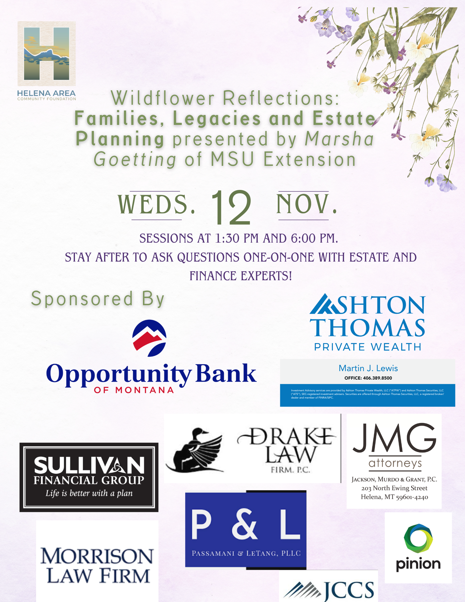 Join the Helena Area Community Foundation for an engaging presentation with Marsha Goetting, one of Montana’s most dynamic estate planning educators. With her signature blend of storytelling and Montana wildflowers, Marsha makes complex topics come alive—helping you understand why having a will matters, what happens if you don’t, and how to make thoughtful decisions about the assets you leave behind. Learn which gifts best support your loved ones—and which can create a lasting legacy for your community.